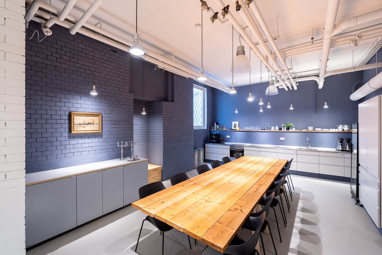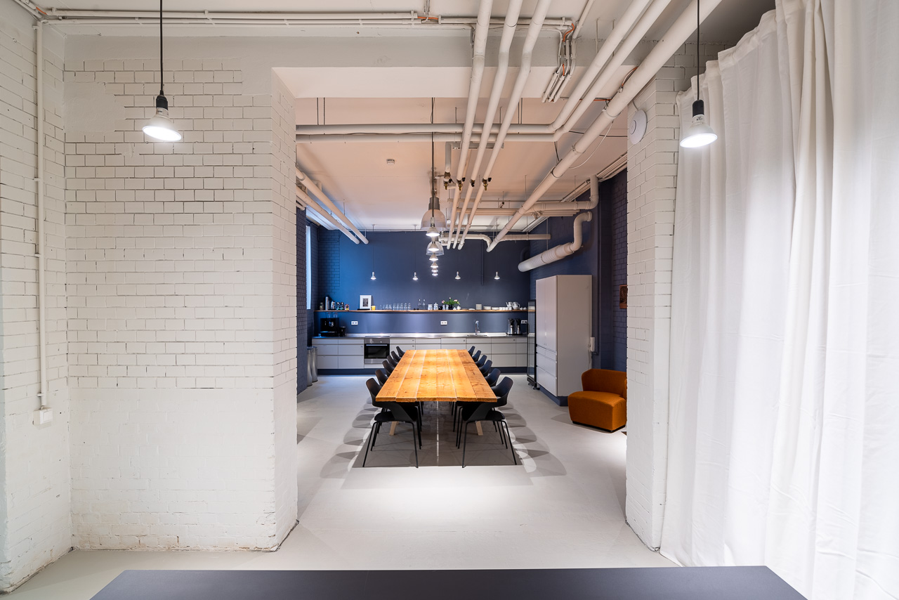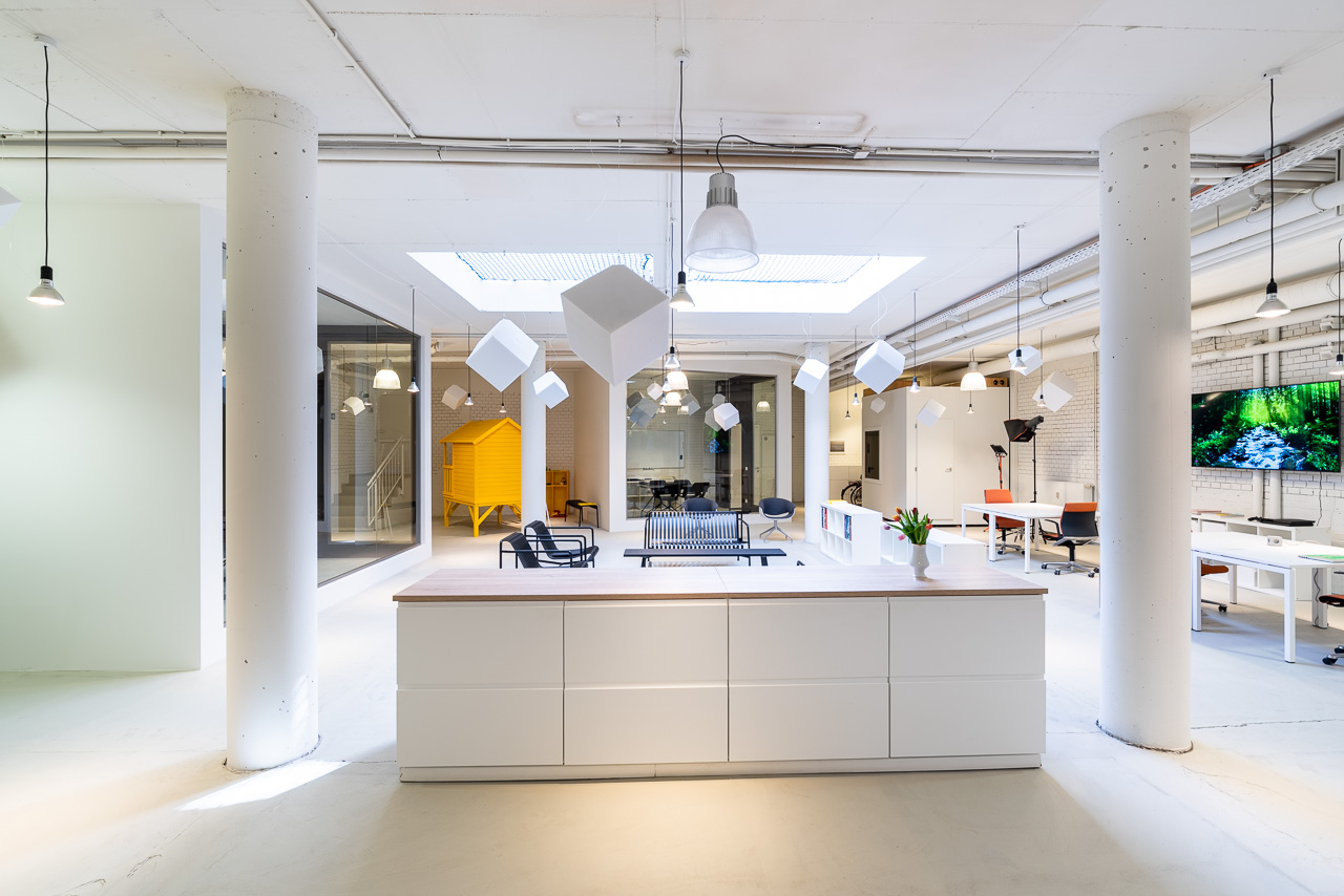 400m2 großes, Studio mit einen ca 300m2 grossen Raum mit zwei kleineren Meetingräumen, einem Podcast-Studio, einem kleinen Kinderspielplatz mit Stelzenhaus und einer 40m2 separaten Küche.