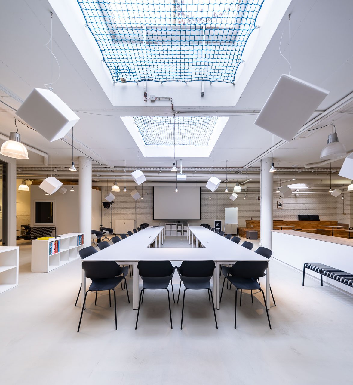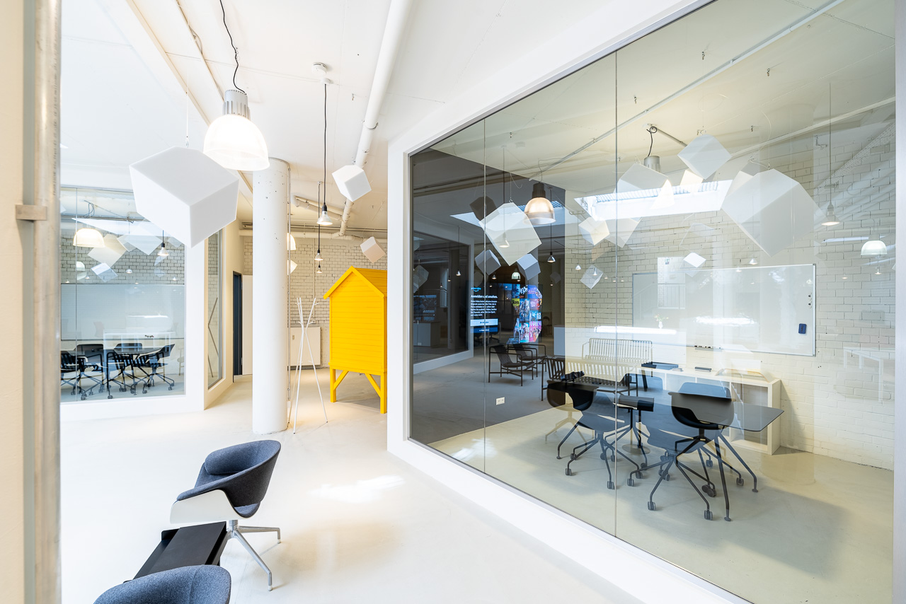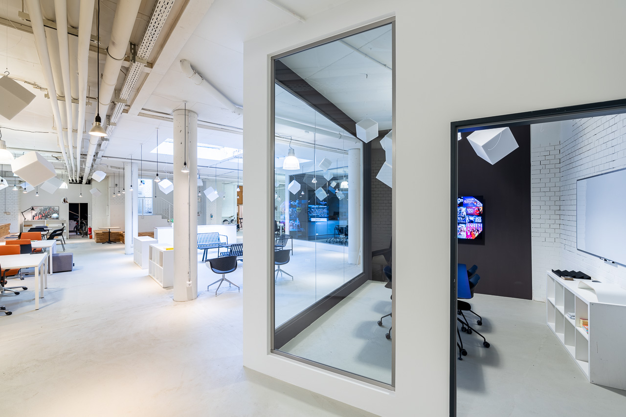400m2 großes, Studio mit einen ca 300m2 grossen Raum mit zwei kleineren Meetingräumen, einem Podcast-Studio, einem kleinen Kinderspielplatz mit Stelzenhaus und einer 40m2 separaten Küche.